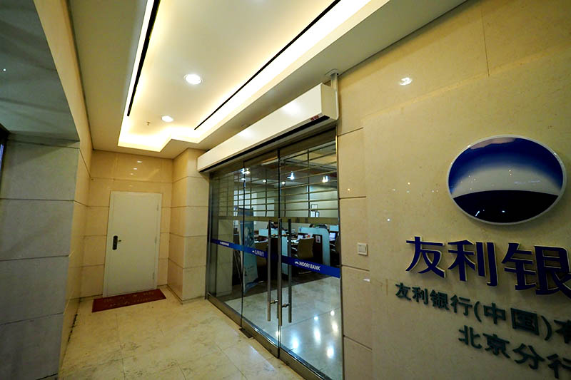 位于双子座大厦的韩国友利银行北京分行,2016年,选用了康平明装电热风幕。