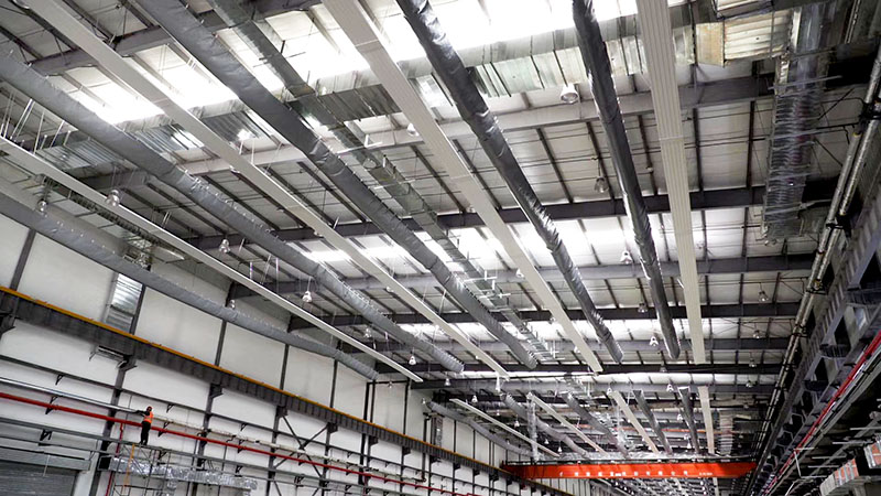 12000平米丹麦艾尔姆天津工厂几千个快装接口,康平轻量化装配式铜铝复合辐射板轻松通过水系统打压实验