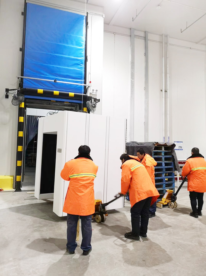 康平冷库无霜空气隔离系统,增加了生产线传送带和冷库保温门一体化模块